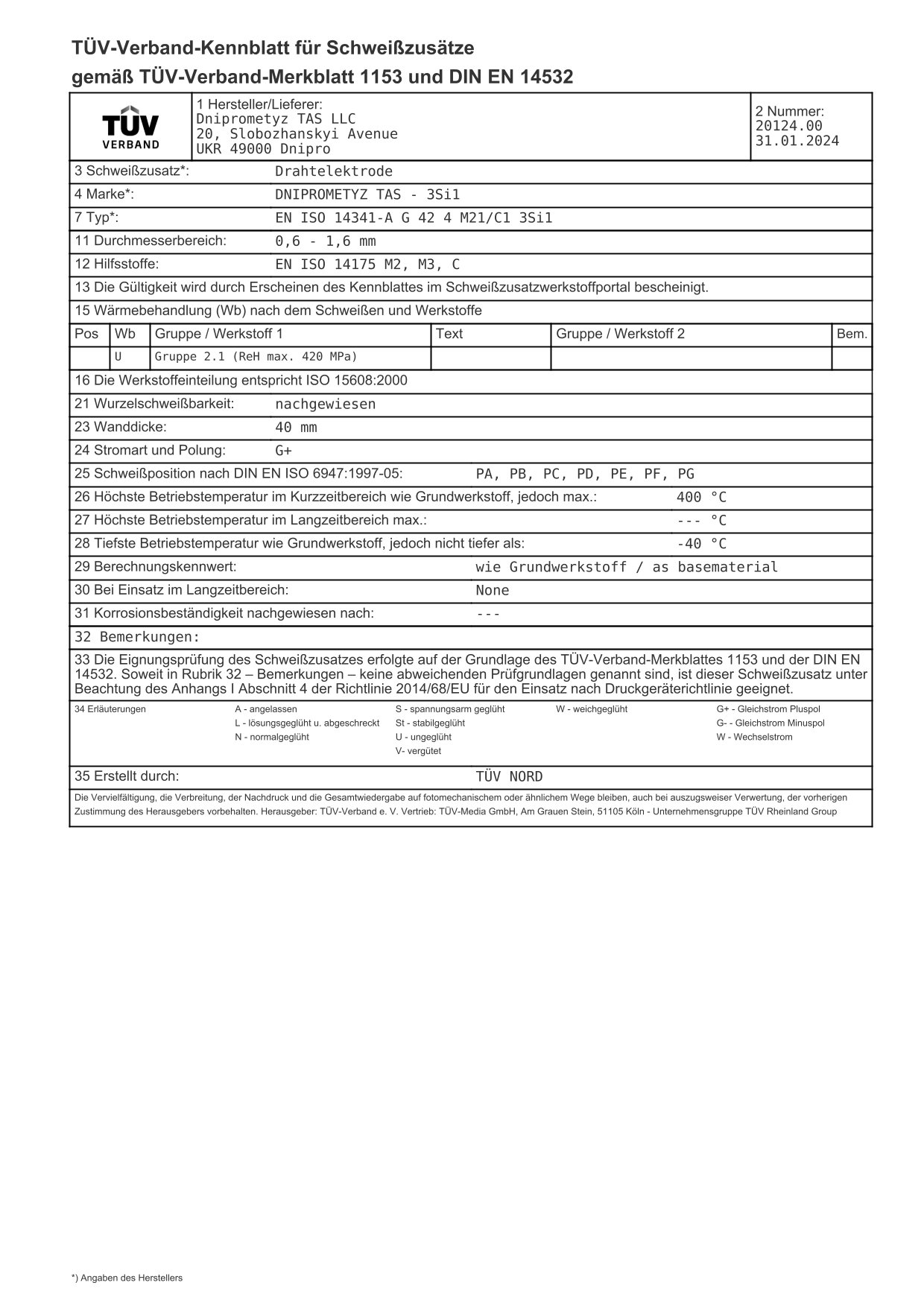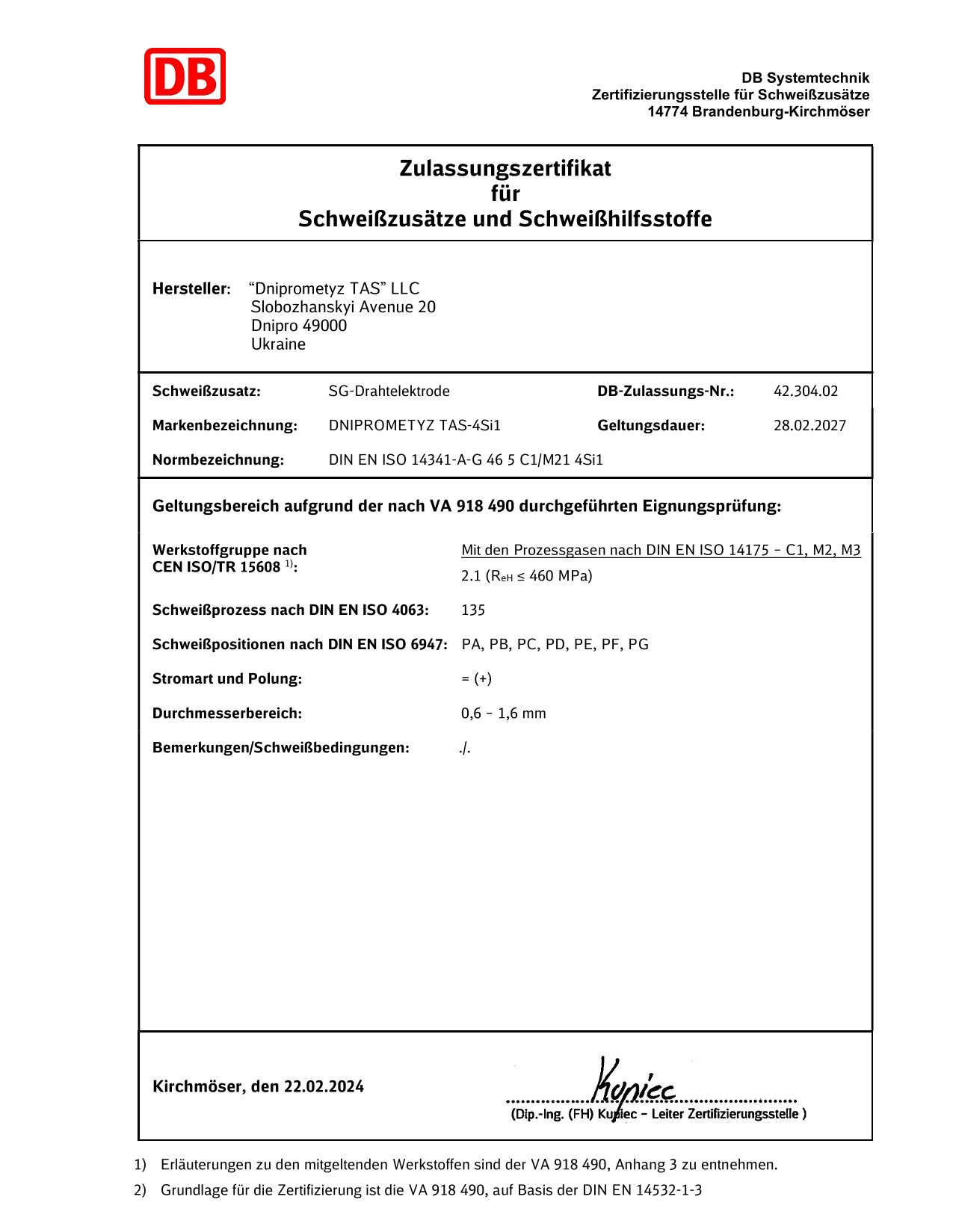 DNIPROMETYZ TAS plant is pleased to announce that it has successfully passed the factory production audit, which was carried out by qualified specialists from Deutsche Bahn AG. The result of the audit was the completion of qualification tests of copper-bonded alloyed welding wire grades 3Si1 and 4Si1, with a diameter of 0.6 — 1.6 mm, as well as the receipt of a certificate of conformity from Deutsche Bahn.